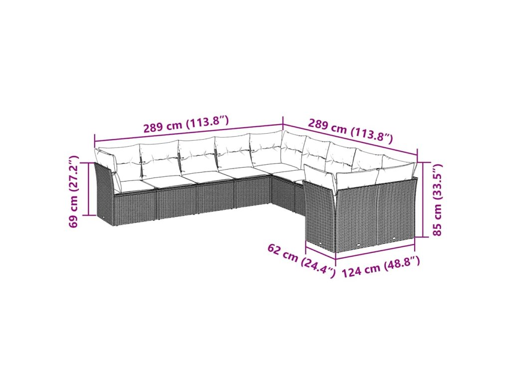 - Celkové rozměry pohovky: 289 x 289 x 69 cm (Š x H x V)