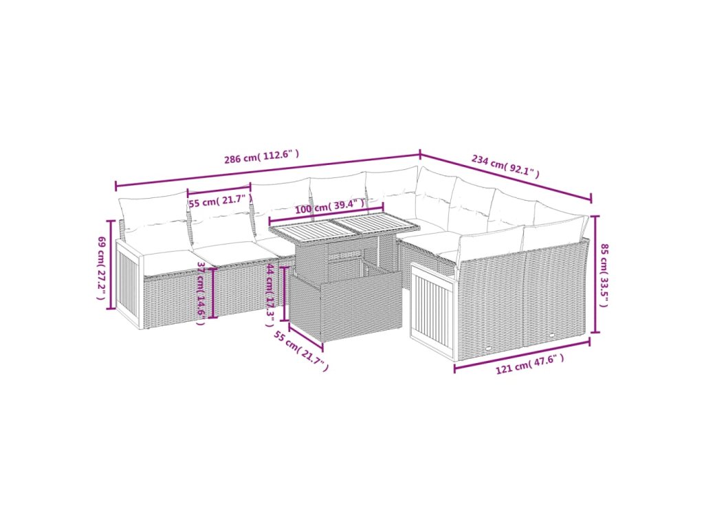 Tato zahradní sedací souprava je dokonalým doplňkem vaší zahrady, terasy nebo dvorku a poskytne vám pohodlné a příjemné místo, kde si můžete povídat s rodinou a přáteli nebo jen tak odpočívat a užívat si pobyt venku.
