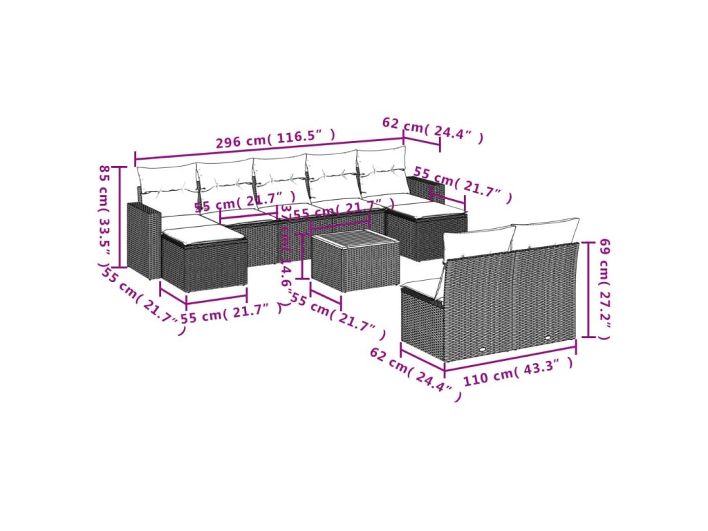 Tato zahradní sedací souprava je dokonalým doplňkem vaší zahrady, terasy nebo dvorku a poskytne vám pohodlné a příjemné místo, kde si můžete povídat s rodinou a přáteli nebo jen tak odpočívat a užívat si pobyt venku.