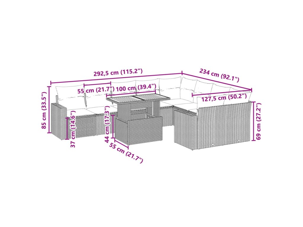 Tato zahradní sedací souprava je dokonalým doplňkem vaší zahrady, terasy nebo dvorku a poskytne vám pohodlné a příjemné místo, kde si můžete povídat s rodinou a přáteli nebo jen tak odpočívat a užívat si pobyt venku.