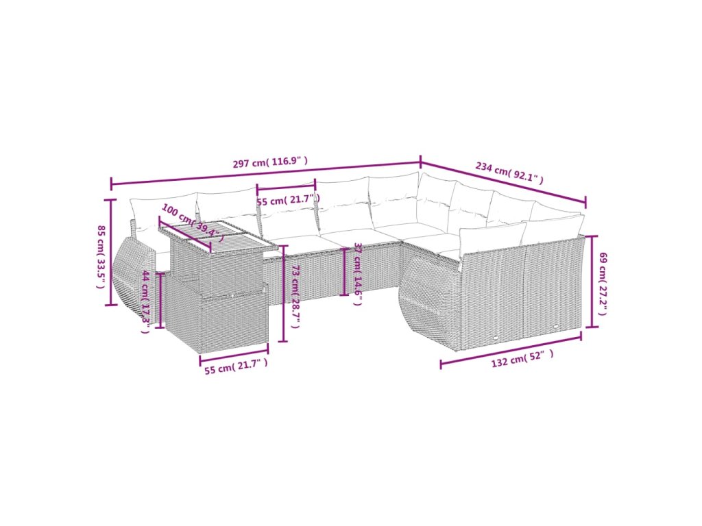 Tato zahradní sedací souprava je dokonalým doplňkem vaší zahrady, terasy nebo dvorku a poskytne vám pohodlné a příjemné místo, kde si můžete povídat s rodinou a přáteli nebo jen tak odpočívat a užívat si pobyt venku.