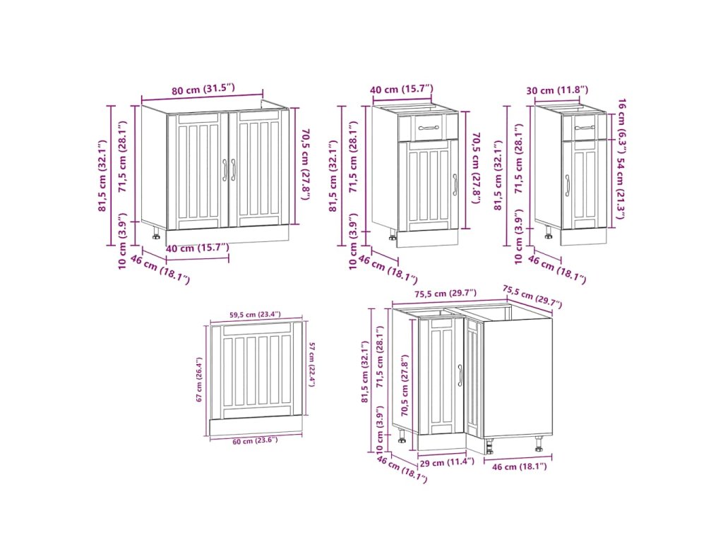 - 1 x kuchyňská rohová spodní skříňka: 75,5 x 75,5 x 81,5 cm (Š x H x V)