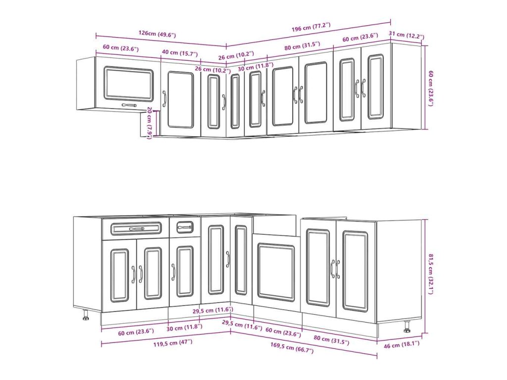 - Dostatek úložného prostoru: Sada kuchyňských skříněk má mnoho přihrádek a nabízí dostatek prostoru pro uložení misek, talířů, hrnců a dalších kuchyňských spotřebičů.