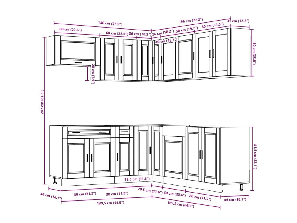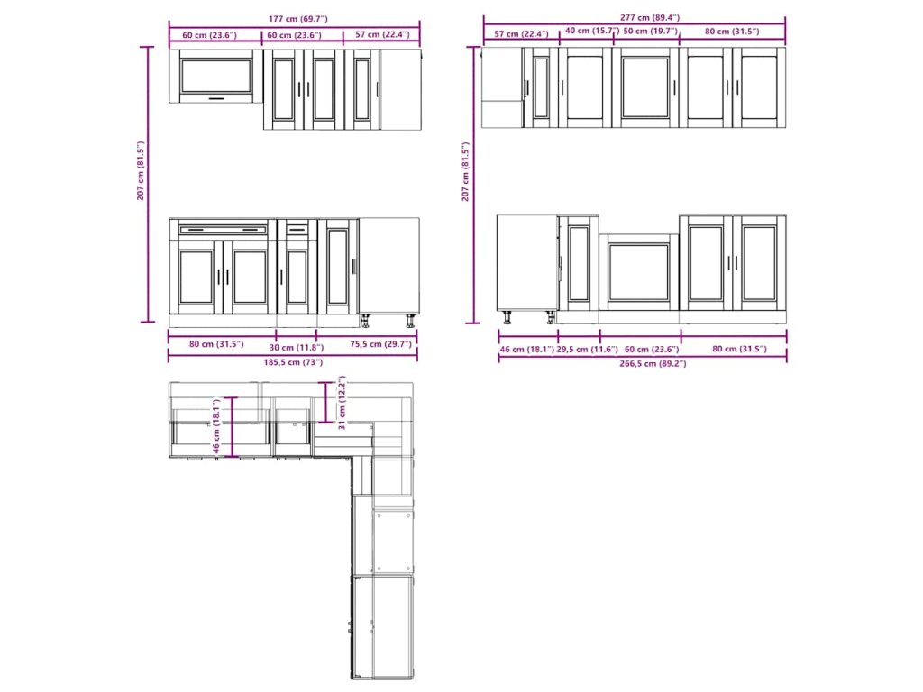 - Dostatek úložného prostoru: Sada kuchyňských skříněk má mnoho přihrádek a nabízí dostatek prostoru pro uložení misek, talířů, hrnců a dalších kuchyňských spotřebičů.
