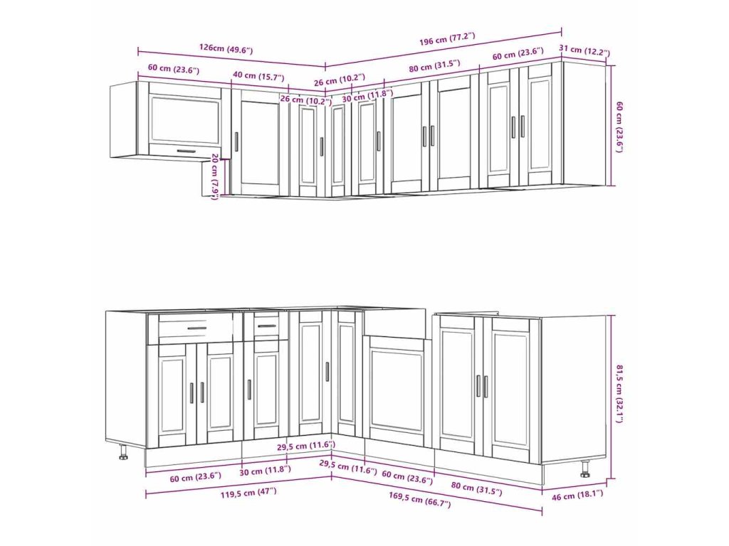 - Dostatek úložného prostoru: Sada kuchyňských skříněk má mnoho přihrádek a nabízí dostatek prostoru pro uložení misek, talířů, hrnců a dalších kuchyňských spotřebičů.