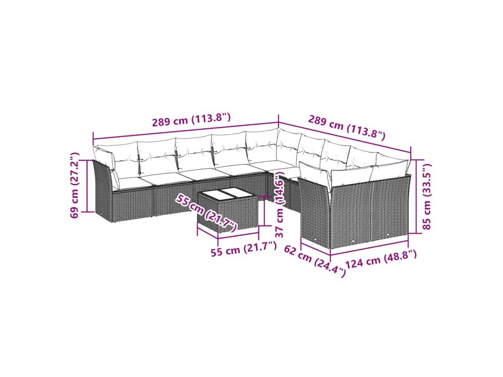 - Celkové rozměry pohovky: 289 x 289 x 69 cm (Š x H x V)