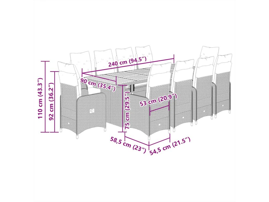 - Materiál: PE ratan, práškově lakovaná ocel, masivní akáciové dřevo s olejovou povrchovou úpravou