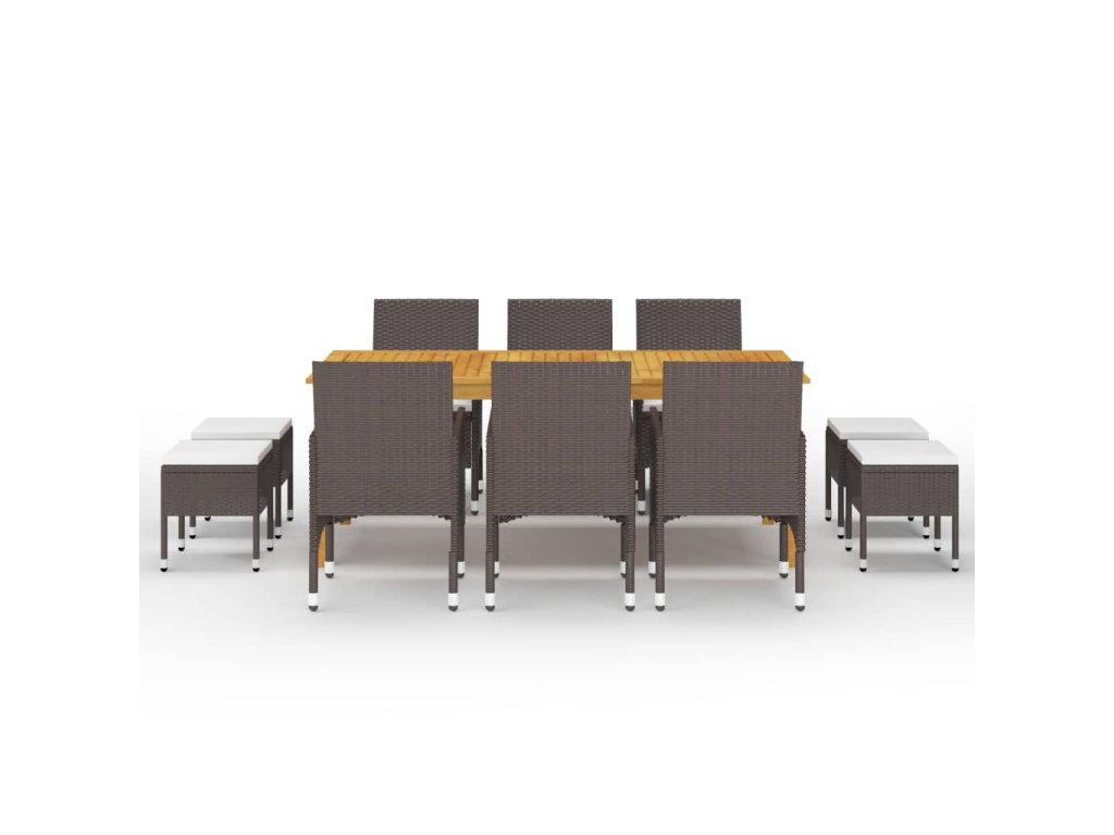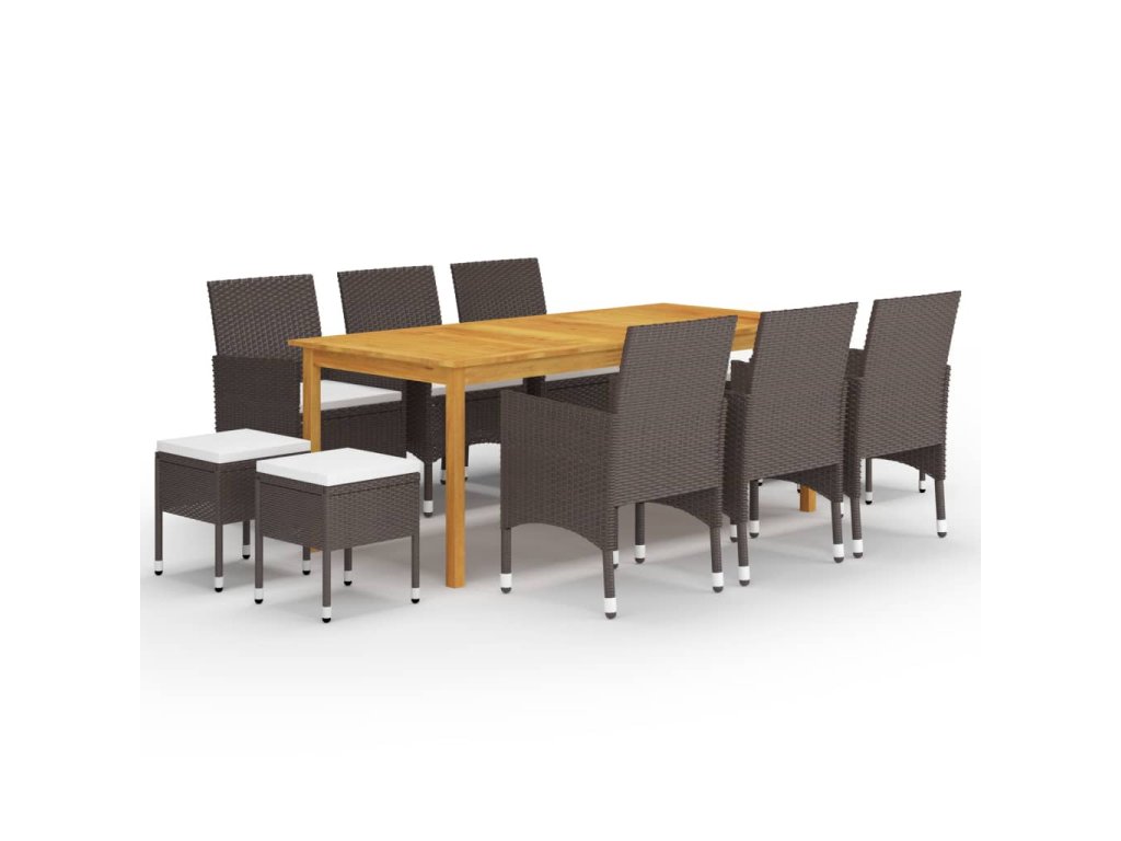 Jídelní stůl je zhotovený z masivního akáciového dřeva s olejovaným povrchem, takže je stabilní, odolný a snadno se udržuje. Bytelné jídelní židle a stoličky mají rám z práškově lakované oceli, opletený PE ratanem, který výborně vzdoruje klimatickým vlivům a snadno se čistí. Zahradní židle mají zaoblená opěradla a područky, což přispívá k většímu pohodlí, stejně jako jejich ergonomický tvar. Každé křeslo je opatřené odnímatelnou, hustě polstrovanou poduškou, abyste si při odpočinku užili mimořádný komfort.