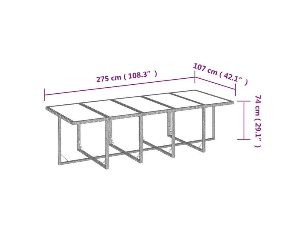 - Celkové rozměry stolu: 275 x 107 x 74 cm (D x Š x V)