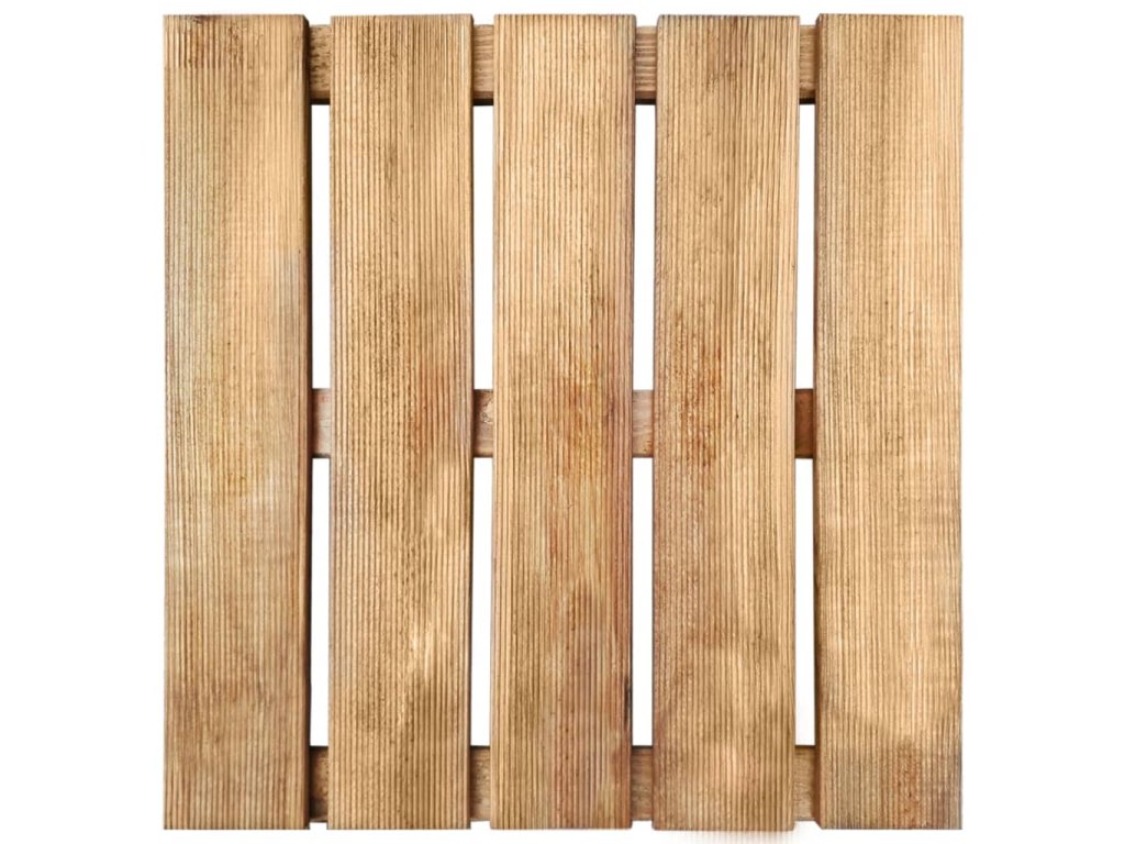 Terasové dlaždice jsou vyrobené z impregnovaného borového dřeva. Jedná se o velmi odolné dřevo, které nepodléhá hnilobě ani vlivům počasí. Překrásná kresba dřeva propůjčuje dlaždicím rustikální kouzlo a jedinečný, neopakovatelný vzhled. Balení obsahuje 12 terasových dlaždic.