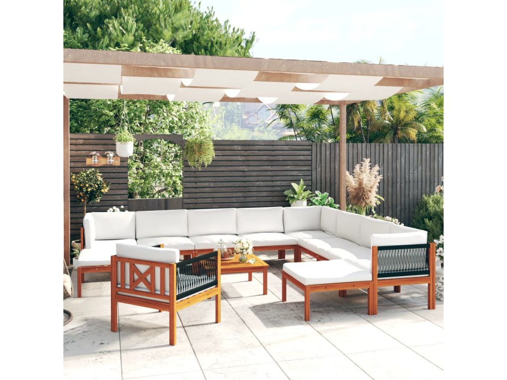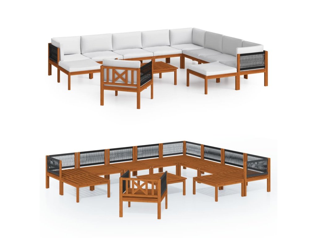 12dílná zahradní sedací souprava s polštáři krémové dřevo akácie a provaz 3057894