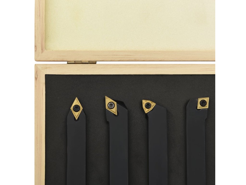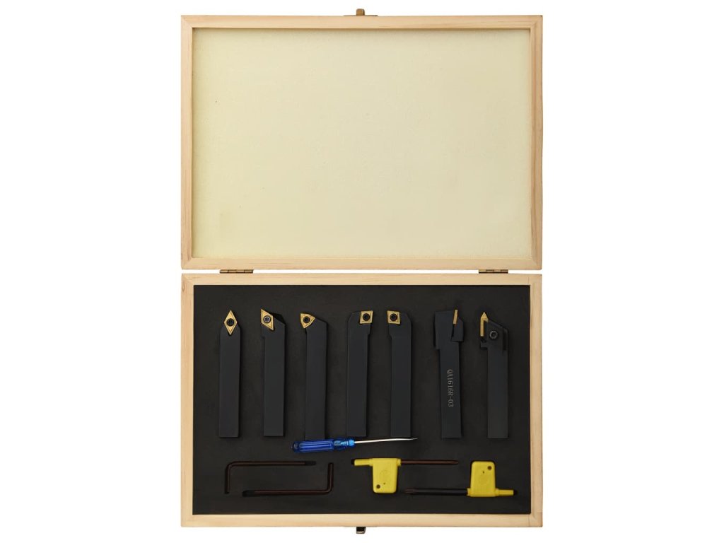 Tyto nástroje jsou vyrobené z uhlíkové oceli a slinutého karbidu a nabízejí vysokou tvrdost a dobrou houževnatost. Držáky mají černý oxidovaný hladký povrch, označený typem držáku nástroje a rozměry trhu. Vložka každého nástroje je vyměnitelná a indexovatelná. Součástí dodávky jsou také vyměnitelné klíče. Sada je dodávaná s boxem pro snadné skladování a přepravu.