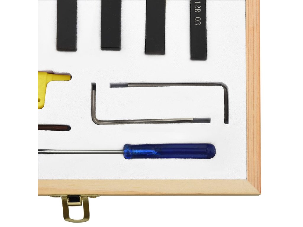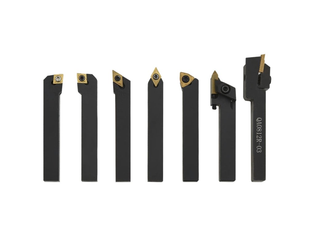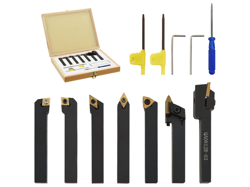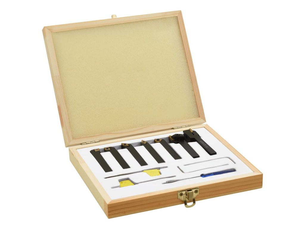 Tyto nástroje jsou vyrobené z uhlíkové oceli a slinutého karbidu a nabízejí vysokou tvrdost a dobrou houževnatost. Držáky mají černý oxidovaný hladký povrch, označený typem držáku nástroje a rozměry trhu. Vložka každého nástroje je vyměnitelná a indexovatelná. Součástí dodávky jsou také vyměnitelné klíče. Sada je dodávaná s boxem pro snadné skladování a přepravu.