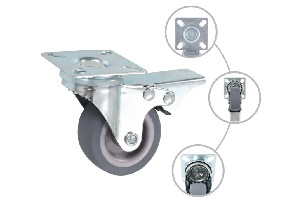 Kolečka jsou vyrobená z TPR (termoplastické gumy), která je známá pro svou schopnost pohlcovat nárazy a vibrace. Ať už tedy kolečka namontujete na cokoliv, budete to moci přesouvat hladce a v tichosti. Jejich hladký povrch navíc ochrání vaši podlahu před poškrábáním. Zinkem potažený ocelový rám je odolný proti rzi, dodává kolečkům na odolnosti a prodlužuje jejich životnost. Otočná kolečka jsou vybavená brzdou pro flexibilnější ovládání. Každé kolečko má maximální nosnost až 35 kg.