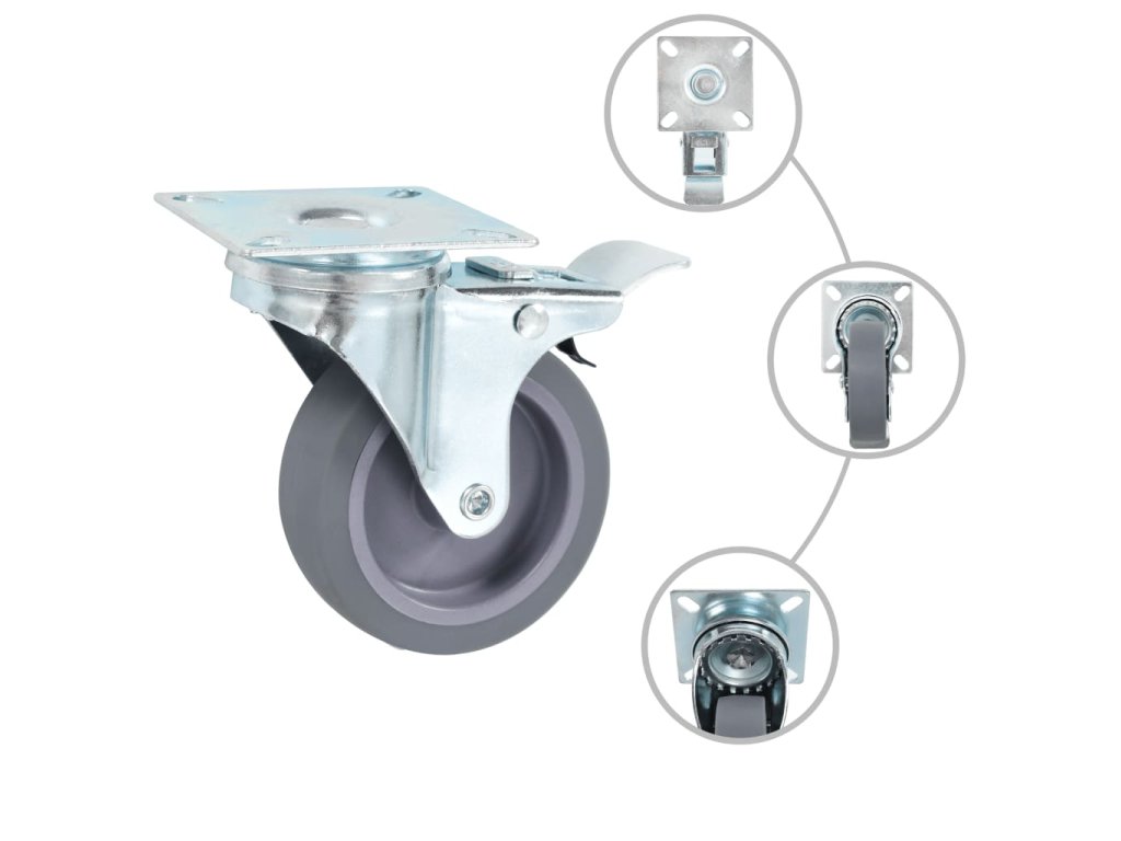 Kolečka jsou vyrobená z TPR (termoplastické gumy), která je známá pro svou schopnost pohlcovat nárazy a vibrace. Ať už tedy kolečka namontujete na cokoliv, budete to moci přesouvat hladce a v tichosti. Jejich hladký povrch navíc ochrání vaši podlahu před poškrábáním. Zinkem potažený ocelový rám je odolný proti rzi, dodává kolečkům na odolnosti a prodlužuje jejich životnost. Otočná kolečka jsou vybavená brzdou pro flexibilnější kontrolu. Každé kolečko má maximální nosnost až 45 kg.