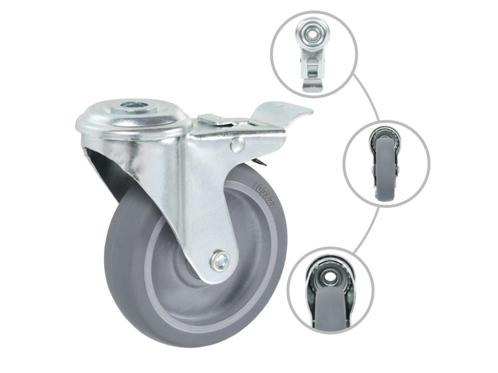 Kolečka jsou vyrobená z TPR (termoplastické gumy), která je známá pro svou schopnost pohlcovat nárazy a vibrace. Ať už tedy kolečka namontujete na cokoliv, budete to moci přesouvat hladce a v tichosti. Jejich hladký povrch navíc ochrání vaši podlahu před poškrábáním. Zinkem potažený ocelový rám je odolný proti rzi, dodává kolečkům na odolnosti a prodlužuje jejich životnost. Otočná kolečka jsou vybavená dvojitou brzdou pro flexibilnější ovládání. Každé kolečko má maximální nosnost až 60 kg.