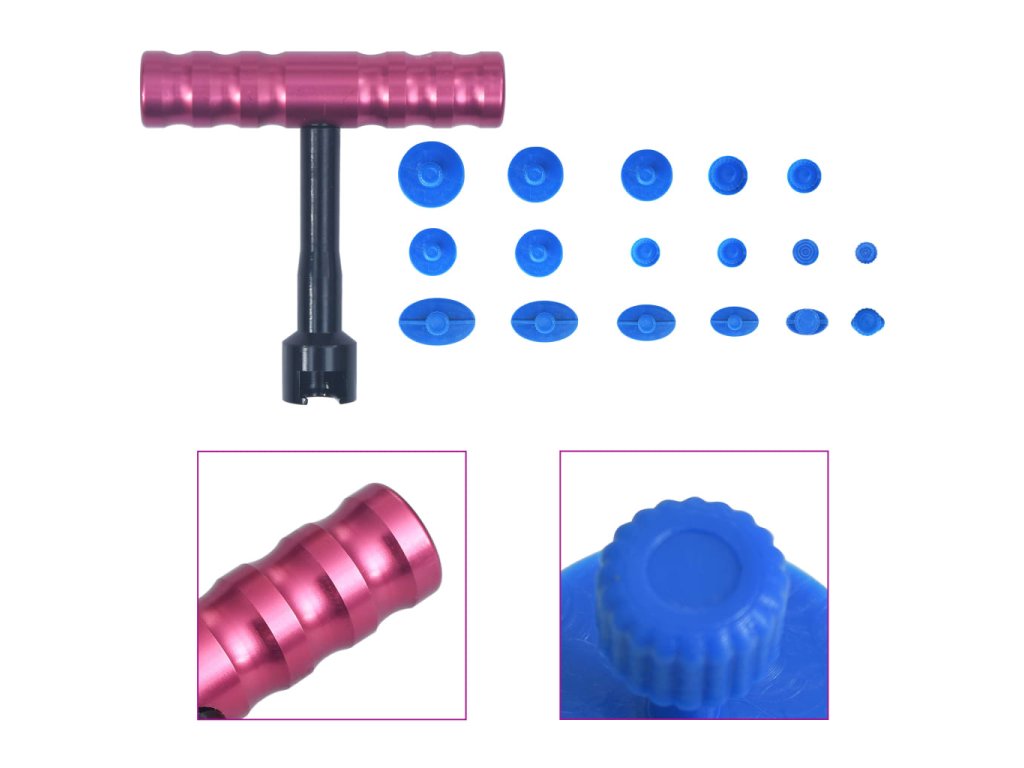 Tato 19dílná sada nářadí obsahuje 1 držák na vytahování přísavek ve tvaru T a 18 lepících přísavek. Je určená k vytahování menších promáčklin na karosérii auta, aniž byste poškodili tovární lakování svého vozu nebo ho museli přelakovávat.