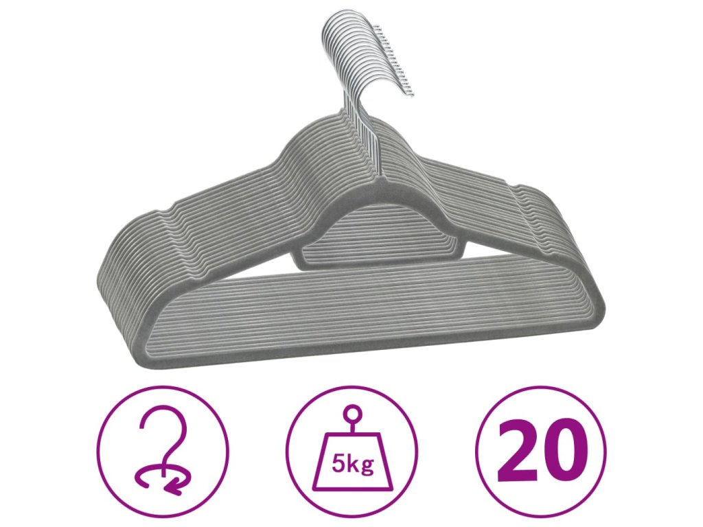 20 ks šatních ramínek protiskluzové šedé samet 289917