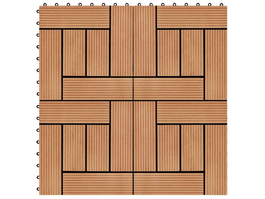 Tuto sadu terasových dlaždic z dřevoplastu tvoří 22 kusů samostatných dlaždic o velikosti 30 x 30 cm, které dohromady pokryjí celkový povrch o rozloze 2 metry čtverečné. Jsou ideální volbou na dvorky a balkony, k bazénu nebo k vířivce anebo třeba do koupelen.