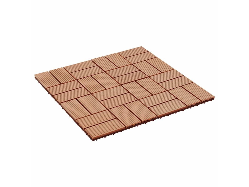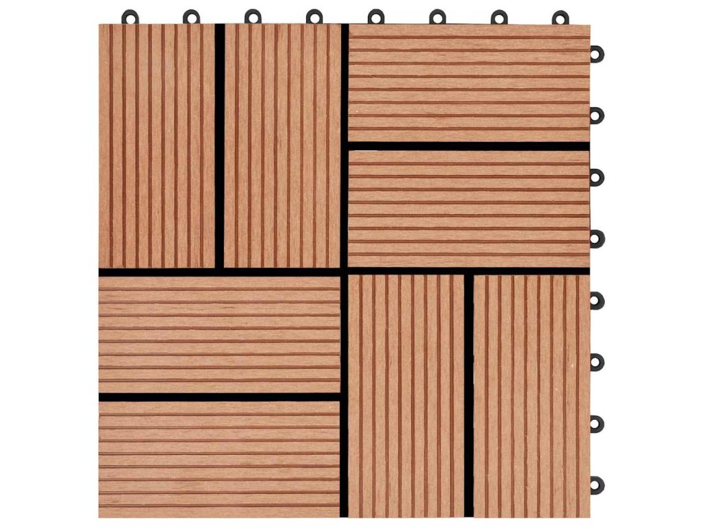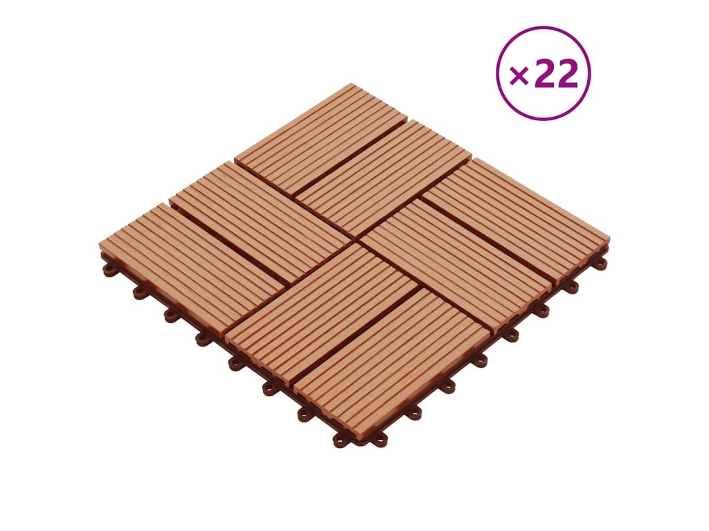 Tuto sadu terasových dlaždic z dřevoplastu tvoří 22 kusů samostatných dlaždic o velikosti 30 x 30 cm, které dohromady pokryjí celkový povrch o rozloze 2 metry čtverečné. Jsou ideální volbou na dvorky a balkony, k bazénu nebo k vířivce anebo třeba do koupelen.