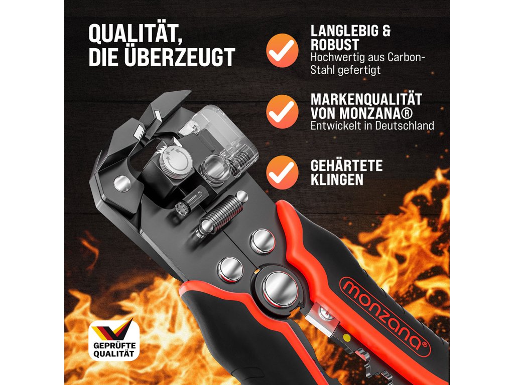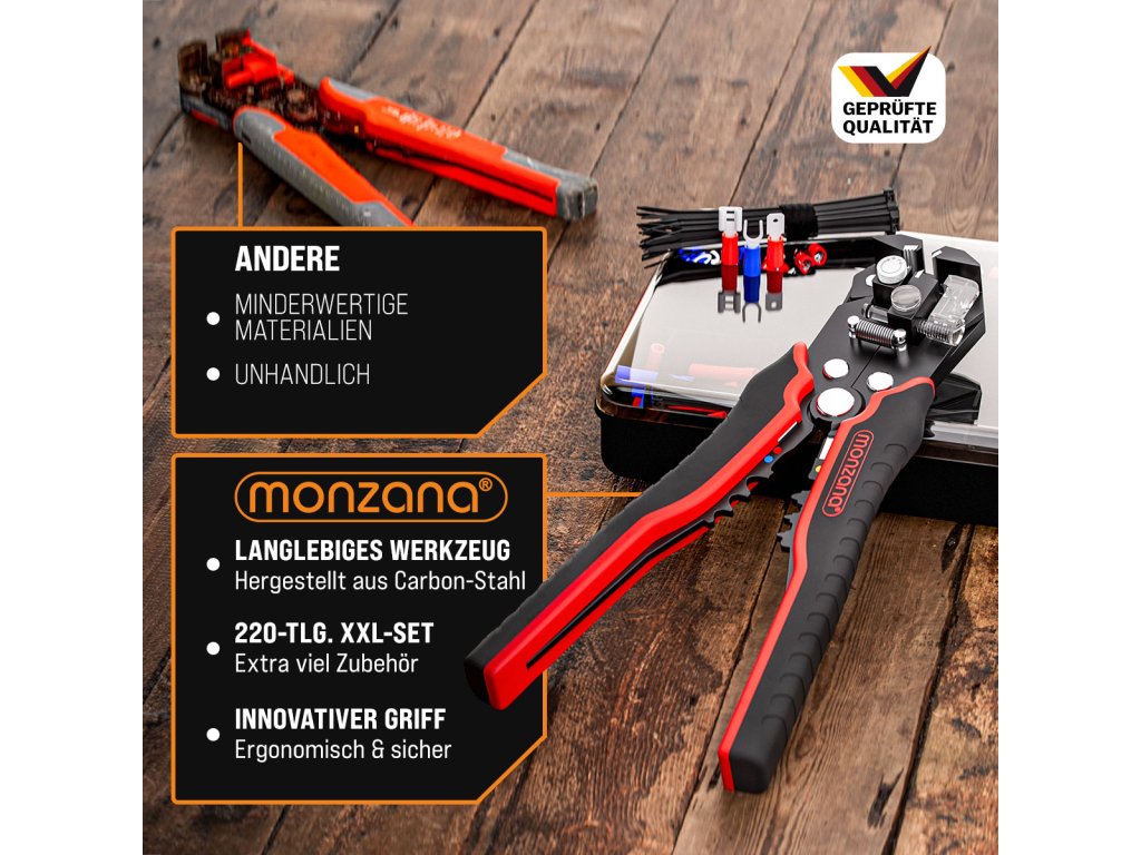Univerzální sada pro elektroinstalace! Tyto multifunkční odizolovací kleště 3v1 od značky MONZANA® umožňují pohodlné odizolování, stříhání i krimpování elektrických vodičů – a to jediným nástrojem.