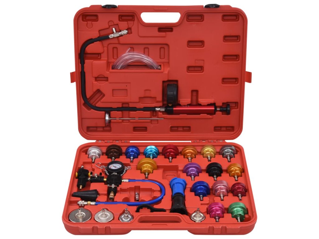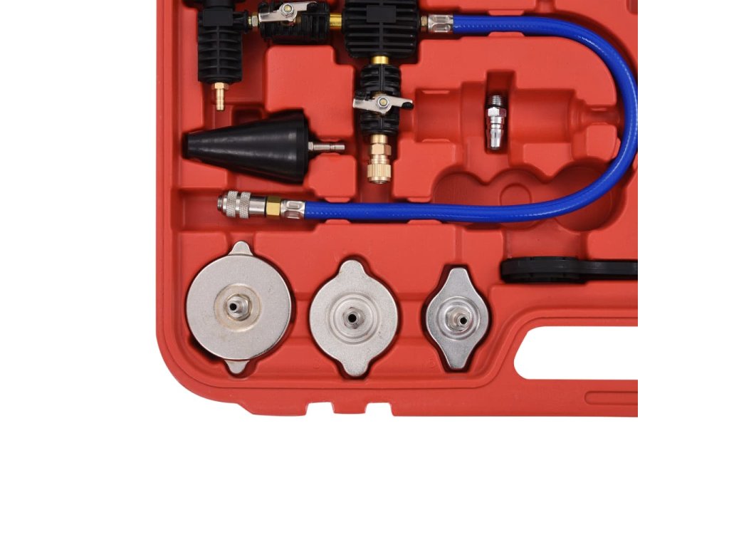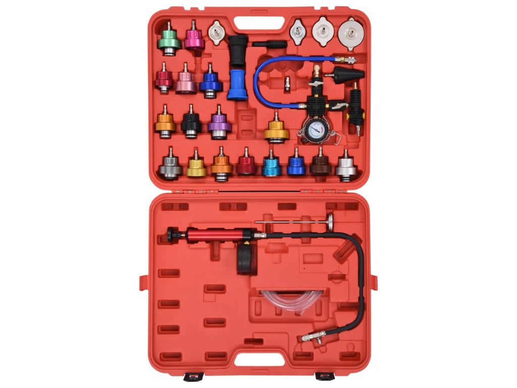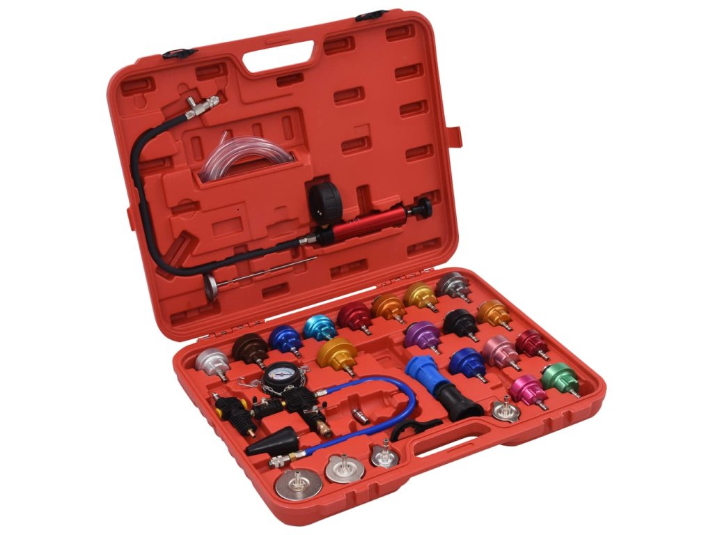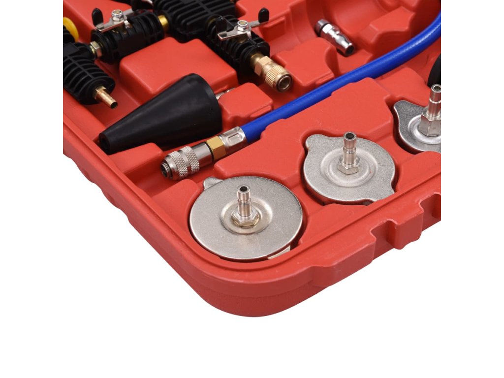 Tato sada, vyrobená z kvalitního plastu a hliníku je praktická, odolná vůči opotřebení a nepodléhá korozi. K dispozici jsou barevně označené testovací uzávěry chladiče, což usnadňuje identifikaci při výběru vhodného testovacího uzávěru. Tato sada je vhodná pro většinu domácích a zahraničních vozidel.