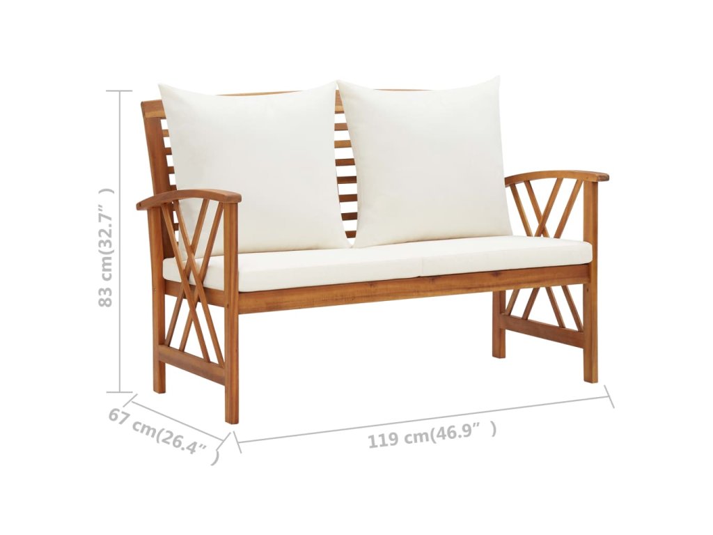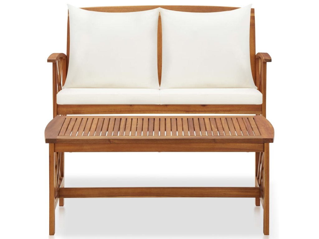 Set zahradního nábytku je zhotovený z masivního akáciového dřeva s olejovou úpravou, je stabilní a má dlouhou životnost. Konferenční stolek z masivní dřevěnou stolní deskou s lamelovým designem poslouží jako perfektní odkládací plocha pro vaše občerstvení, mísy s ovocem, dekorativní předměty a další nezbytnosti. Podušky na sedák a polštář za záda přispívají k pohodlnému posezení, stejně jako opěradlo a loketní opěrky. Jak stůl, tak lavička mají dvojitý kříž na obou stranách.