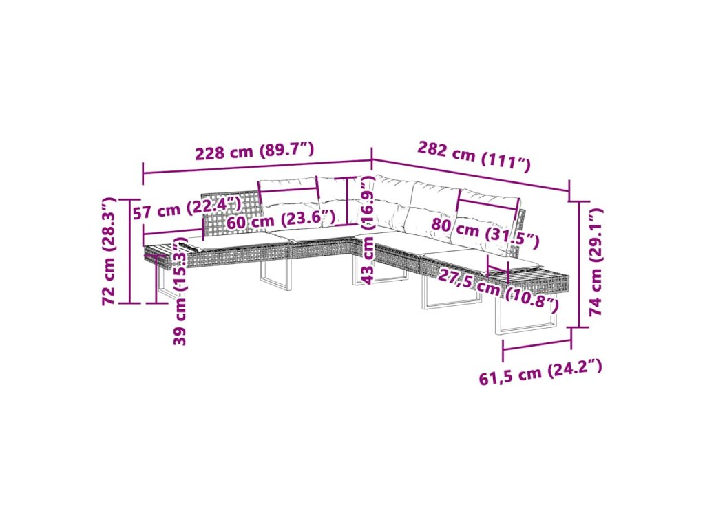 - Celkové rozměry: 282 x 228 x 74 cm (Š x H x V)