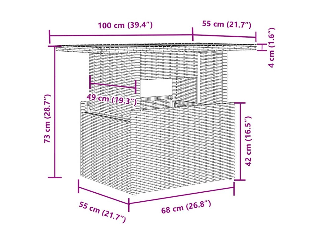 - Skleněná deska stolu: Deska venkovního stolu je zhotovena ze silného a odolného tvrzeného skla, takže ji snadno očistíte vlhkým hadříkem a zároveň do vašeho venkovního prostoru vnese nádech elegance.