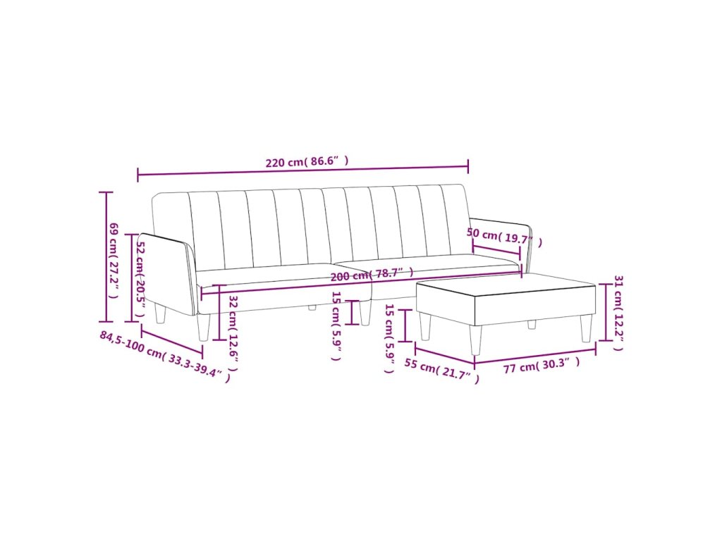 - Celkové rozměry: 220 x 84,5 x 69 cm (D x Š x V)