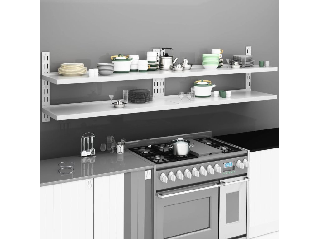 Naše sada 2patrových nástěnných polic z nerezové oceli je nejen stylová, ale také velmi praktická a ideálně se hodí pro všechny, kdo potřebují v kuchyní více úložného prostoru. Nabízí perfektní úložné řešení pro talíře, nádobí či jiné kuchyňské náčiní.