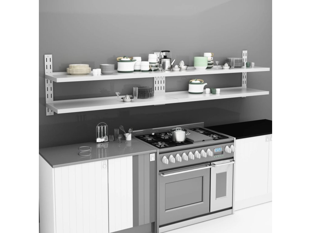 Naše sada 2patrových nástěnných polic z nerezové oceli je nejen stylová, ale také velmi praktická a ideálně se hodí pro všechny, kdo potřebují v kuchyní více úložného prostoru. Nabízí perfektní úložné řešení pro talíře, nádobí či jiné kuchyňské náčiní.