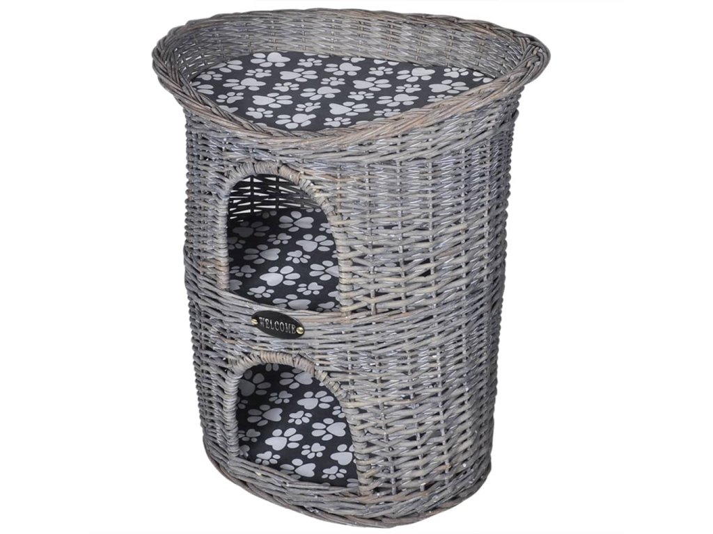 Tento kočičí domeček je vyroben z vrbového proutí, je tedy bytelný, ale zároveň lehký, takže se dá snadno přenášet. Tento 2patrový kočičí domeček můžete používat také venku, v zahradě nebo na terase, a to jak pro kočky a koťata, tak i pro psy a štěňata. Slouží ke spánku, odpočinku a hře. Vaši mazlíčci si budou užívat sluneční paprsky, když se budou slunit na jeho horní ploše!