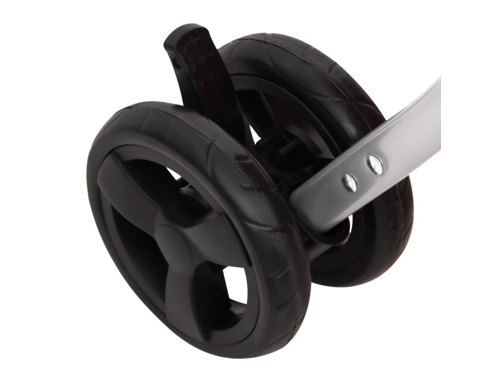 - Praktická kolečka: Přední kolečka lze otáčet do všech směrů, zatímco zadní kolečka s brzdami pomohou kočárek v případě potřeby zabrzdit.