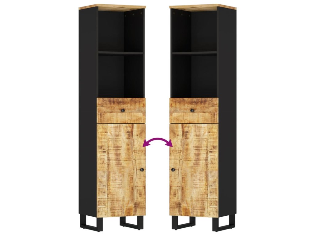 - Masivní mangovníkové dřevo: Skříňka je vyrobena z masivního mangovníku v kombinaci s kompozitním dřevem. Masivní mangovníkové dřevo je pevné tropické tvrdé dřevo, ze kterého se vyrábí robustní nábytek. Krásná kresba dřeva propůjčuje každému kusu nábytku jeho jedinečný a od všech ostatních lehce odlišný vzhled.