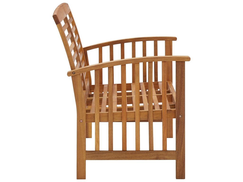 Set zahradního nábytku je zhotovený z masivního akáciového dřeva s olejovou úpravou, je stabilní a má dlouhou životnost. Konferenční stolek z masivní dřevěnou stolní deskou s lamelovým designem poslouží jako perfektní odkládací plocha pro vaše občerstvení, mísy s ovocem, dekorativní předměty a další nezbytnosti. Na lavičce s jemně zaobleným opěradlem a loketními opěrkami se velmi pohodlně sedí.
