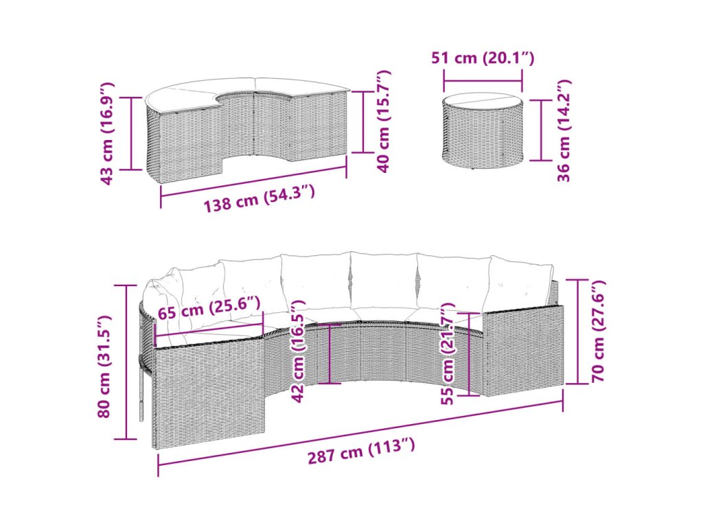 Tato půlkruhová zahradní sedací souprava je dokonalým doplňkem vaší zahrady, terasy nebo dvorku a poskytne vám pohodlné a příjemné místo, kde si můžete povídat s rodinou a přáteli nebo jen tak odpočívat a užívat si pobyt venku.