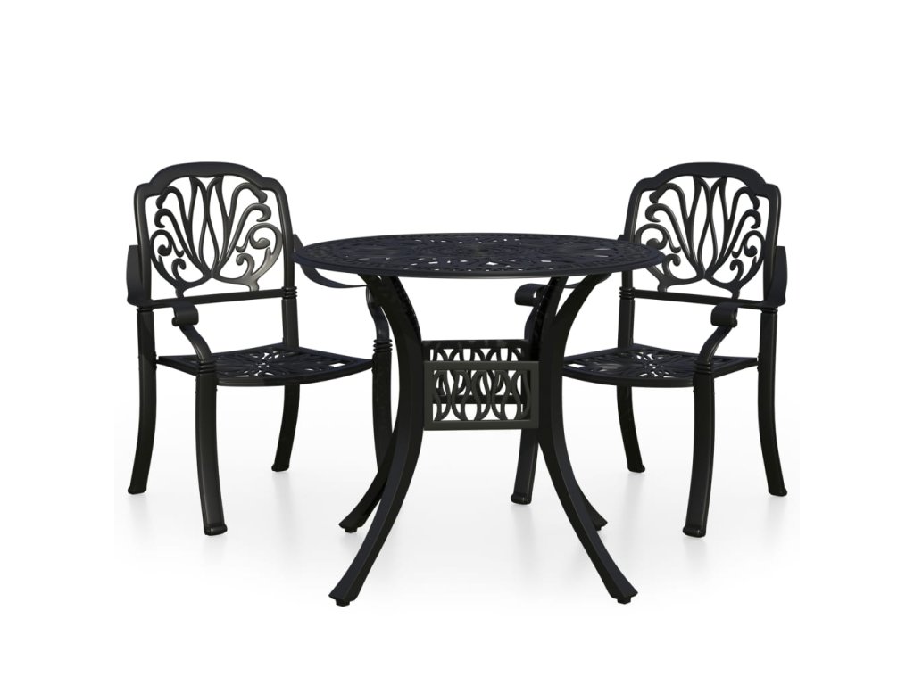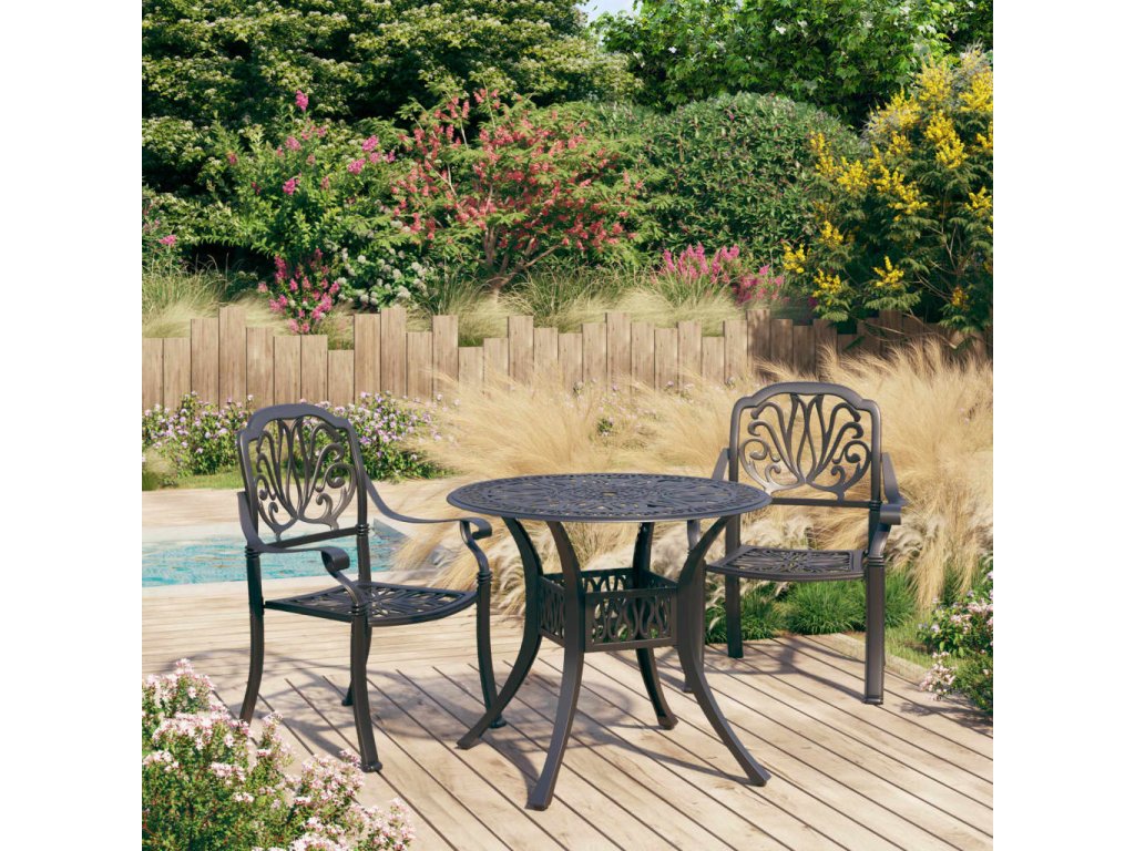 Zahradní stůl a židle z litého hliníku jsou robustní a hodně toho vydrží. Jelikož jsou vyrobené z materiálu, který nerezaví a nepodléhá klimatickým vlivům, jedná se o ideální nábytek pro venkovní použití. Vzhledem ke svému překrásnému designu zapůsobí bistro set ve vašem venkovním bydlení jako elegantní doplněk. Konferenční stolek má navíc uprostřed otvor, kam můžete zasunout slunečník, abyste se ochránili před sluníčkem či deštěm.