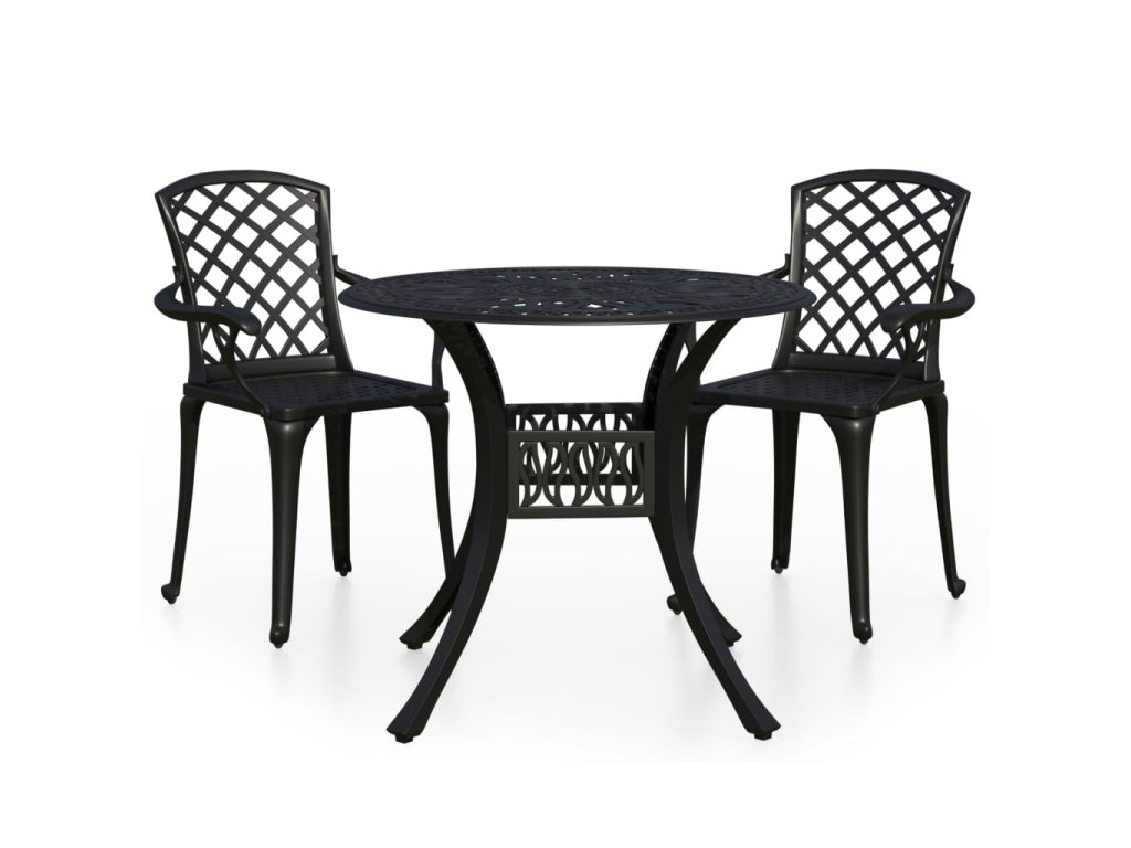 Zahradní stůl a židle z litého hliníku jsou robustní a hodně toho vydrží. Jelikož jsou vyrobené z materiálu, který nerezaví a nepodléhá klimatickým vlivům, jedná se o ideální nábytek pro venkovní použití. Vzhledem ke svému překrásnému designu zapůsobí bistro set ve vašem venkovním bydlení jako elegantní doplněk. Konferenční stolek má navíc uprostřed otvor, kam můžete zasunout slunečník, abyste se ochránili před sluníčkem či deštěm.