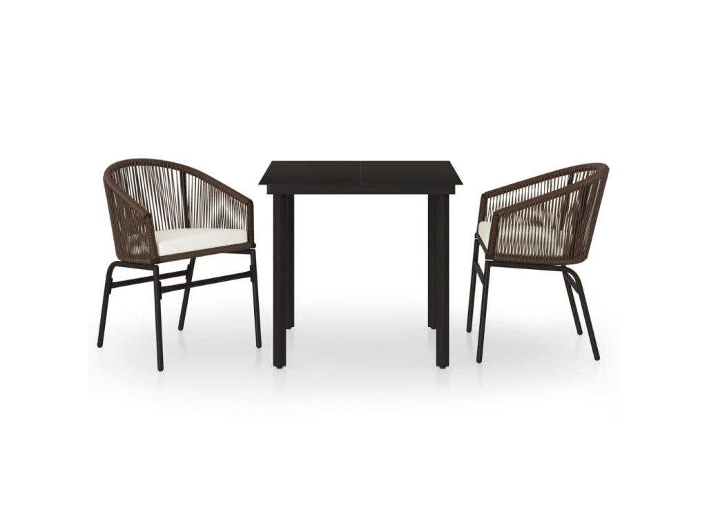Zahradní jídelní set má práškově lakovaný ocelový rám, takže je robustní a stabilní a ideální pro venkovní použití. Hladká skleněná deska stolu se snadno čistí vlhkým hadříkem a skvěle vám poslouží k podávání jídla a pití nebo k vystavení různých dekorativních předmětů. Židle jsou vyrobené z PVC ratanu, jsou proto odolné a výborně vzdorují UV záření i špatnému počasí. Každá z nich je navíc opatřená odnímatelnou hustě polstrovanou poduškou, a zpříjemní vám tak váš odpočinek.