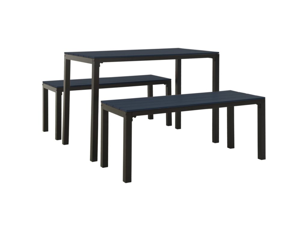 Jídelní set na terasu je vyroben z oceli a WPC (dřevoplastového kompozitu), kombinace dřeva a plastu, což je bezpečný a trvanlivý materiál pro venkovní použití. Lavičky vám poskytnou pohodlné sezení, zatímco robustní stolní deska je ideální pro servírování nápojů a jídla.