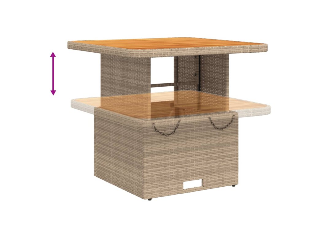 - Nastavitelná deska stolu: Stolní desku lze zvednout tak, aby stůl byl vyšší, takže jej můžete přeměnit z konferenčního stolku na jídelní. Skvěle se hodí pro návštěvy nebo pro stolování venku.