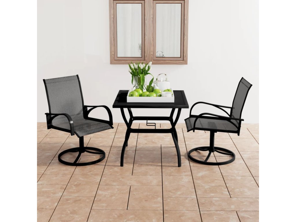 Tento zahradní stůl a jídelní židle jsou vyrobeny z práškově lakované oceli, tudíž jsou robustní a stabilní. Sedadla a opěradla židlí z prodyšné textilní tkaniny dobře větrají a rychle schnou. 360° otočná kulatá základna, ergonomická podpora zad a zaoblené područky vám poskytnou lepší uživatelský komfort a pohodlí při posezení na zahradě.