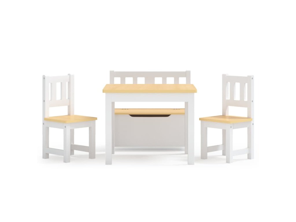 Tato sada stolu a židlí je vyrobena z odolné MDF, takže se snadno čistí a udržuje. Stolek se hodí nejen ke čtení a psaní, ale i ke skládání puzzle, hraní deskových her, dělání různých výtvarných prací nebo třeba k malé večeři. Lavice je dokonalou kombinací místa k sezení a úložného prostoru. Integrovaná úložná truhla s víkem je ideální pro přehledné uschování hraček a dalších věcí. Hrany a rohy stolu a židlí jsou z důvodu bezpečnosti zaoblené. Nábytek se skvěle hodí domů, do školy, do školky a na spoustu dalších míst.