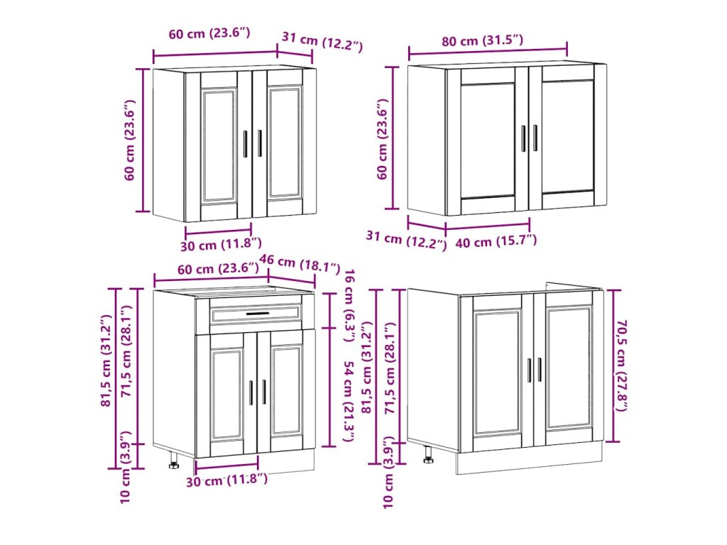 - Dostatek úložného prostoru: Sada kuchyňských skříněk má mnoho přihrádek a nabízí dostatek prostoru pro uložení misek, talířů, hrnců a dalších kuchyňských spotřebičů.