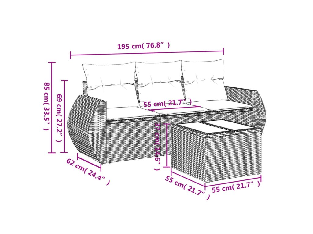 Tato zahradní sedací souprava je dokonalým doplňkem vaší zahrady, terasy nebo dvorku a poskytne vám pohodlné a příjemné místo, kde si můžete povídat s rodinou a přáteli nebo jen tak odpočívat a užívat si pobyt venku.
