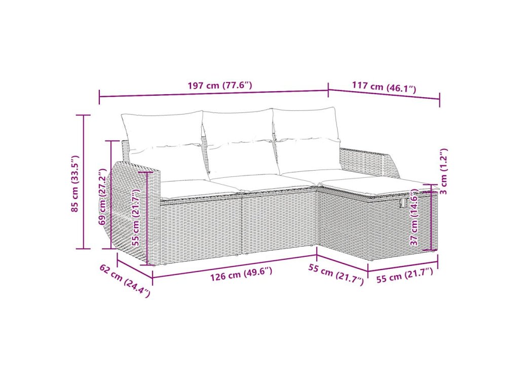 Tato zahradní sedací souprava je dokonalým doplňkem vaší zahrady, terasy nebo dvorku a poskytne vám pohodlné a příjemné místo, kde si můžete povídat s rodinou a přáteli nebo jen tak odpočívat a užívat si pobyt venku.