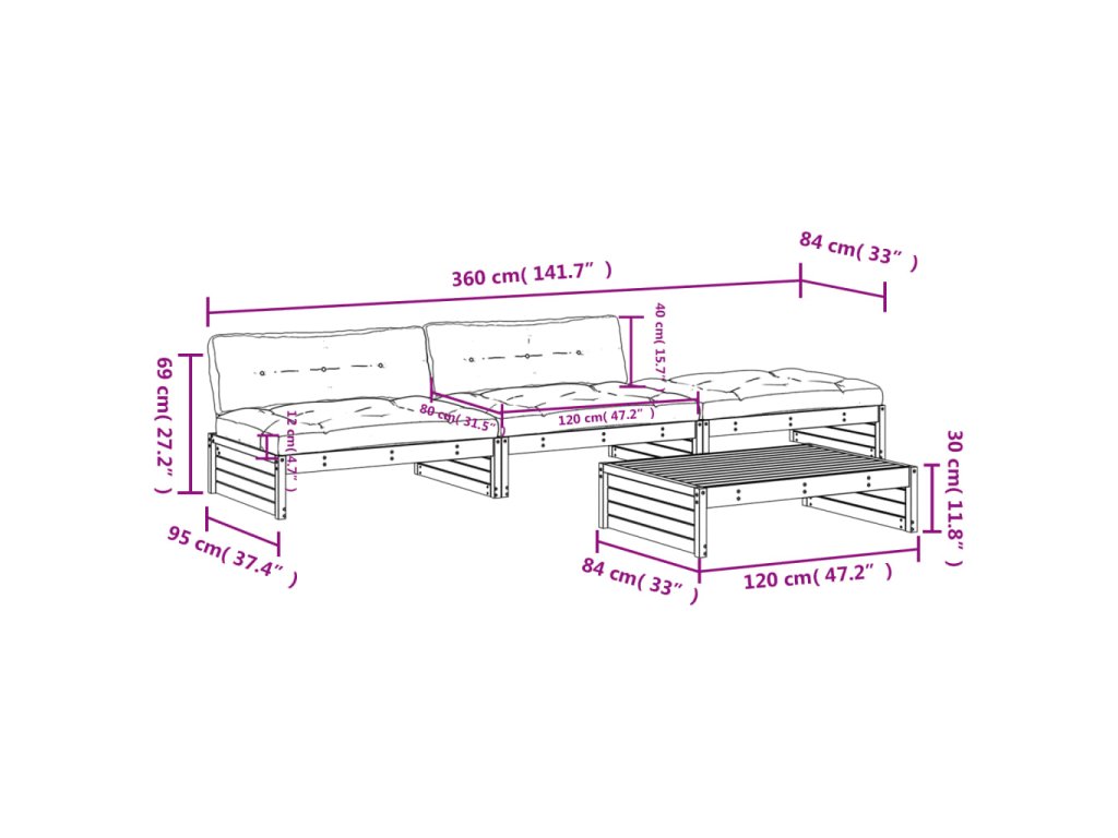 - Rozměry středové pohovky: 120 x 95 x 69 cm (D x Š x V)