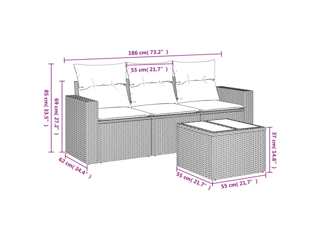 Tato zahradní sedací souprava je dokonalým doplňkem vaší zahrady, terasy nebo dvorku a poskytne vám pohodlné a příjemné místo, kde si můžete povídat s rodinou a přáteli nebo jen tak odpočívat a užívat si pobyt venku.