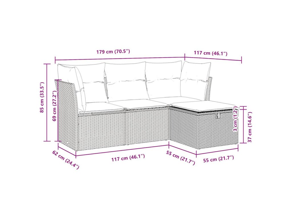 Tato zahradní sedací souprava je dokonalým doplňkem vaší zahrady, terasy nebo dvorku a poskytne vám pohodlné a příjemné místo, kde si můžete povídat s rodinou a přáteli nebo jen tak odpočívat a užívat si pobyt venku.